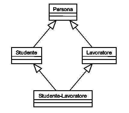 Iniziamo proprio con l'esempio più classico e onnipresente di ereditarietà: uno Studente è-una Persona; un Lavoratore è-una Persona; uno Studente-Lavoratore è-uno Studente ed è-un Lavoratore, da cui si evince il semplice schemino di figura 1, destinato ad apparire su tutti i libri di testo come giustificazione dell'ereditarietà multipla.