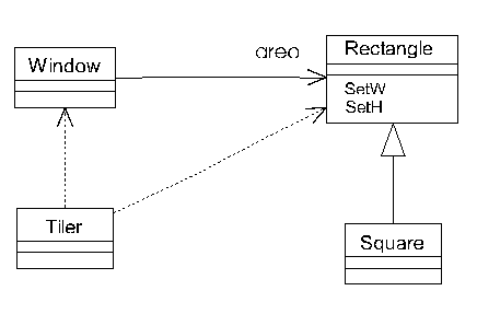 C'é solo un piccolo particolare: quando aggiungiamo la classe Quadrato (e quindi le finestre quadrate), probabilmente il nostro algoritmo pre-esistente per il tiling delle finestre smetterà di funzionare correttamente. Gli algoritmi di tiling ("disponi tutto" per chi usa Windows in versione italiana), nella loro implementazione più semplice, assumono innocentemente che cambiando l'altezza di una finestra la larghezza risulti inalterata, e viceversa. La nostra classe Quadrato, introdotta successivamente, rompe questo contratto.