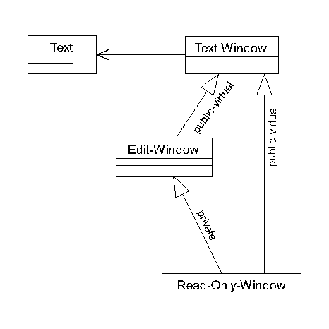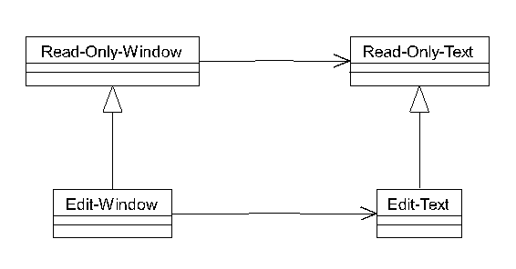 Contrariamente a quanto avrebbero fatto molti lettori, l'autore deriva la classe Edit-Window da Read-Only-Window. Questo sembra un controsenso: se proviamo a leggere il diagramma, viene fuori "una finestra editabile è-una finestra a sola lettura", che suona decisamente male, mentre con il diagramma rovesciato otterremmo un "una finestra a sola lettura è-una finestra editabile" che suona forse un pochino meglio, ma sempre male.