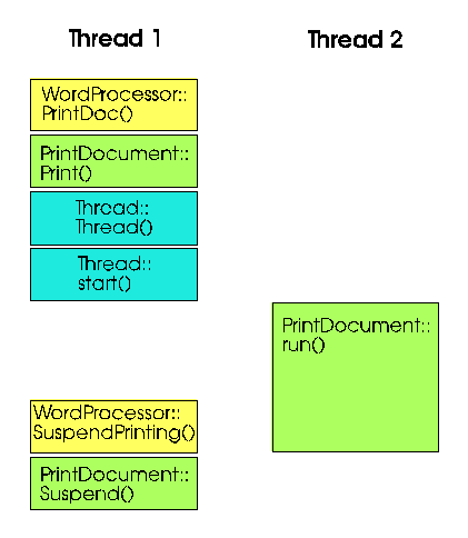 Il codice è molto semplice: quando un oggetto WordProcessor vuole stampare il suo documento, chiede ad un sotto-oggetto PrintDocument di stamparlo. PrintDocument è un "oggetto attivo", ovvero implementa l'interfaccia Runnable. Il suo metodo Print() non fa altro che creare un nuovo thread e mandarlo in esecuzione, usando se stesso come parametro. L'oggetto Thread chiama quindi il metodo run() del suo parametro (in questo caso lo stesso oggetto PrintDocument), che finalmente comincia l'operazione di stampa. Se l'utente decide di interrompere la stampa per qualche ragione, occorre in qualche modo notificare PrintDocument. Nell'approccio classico, "basta" chiamare un metodo di PrintDocument, in questo caso Suspend(). Tutto semplice e lineare, ma vediamo meglio, con l'aiuto della figura 1, la relazione tra oggetti e thread. Ho usato un colore diverso per ogni classe, ed una colonna per ogni thread.